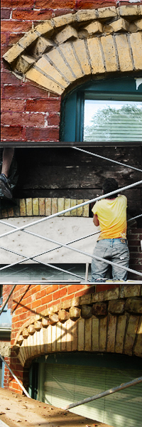 | This house was extensively refaced with reclaimed, period bricks (c. 1890). The arches were rebuilt using the original, buff bricks. Lime mortar was tinted to match, and textured for the authentic, period style. | ||||
