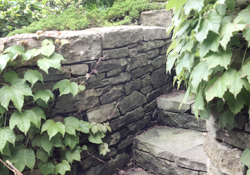 Here, I built a curving stairway and retaining walls to replace a failing, original retaining wall. Upon returning seven years after its construction, I found a functional, enduring wall that fit organically with its surroundings. |